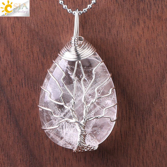 CSJA Tree of Life Crystals Necklace Pendant Water Drop Natural Stone Necklaces Wire Wrap Rose Amethysts Quartz Tiger Eye G953