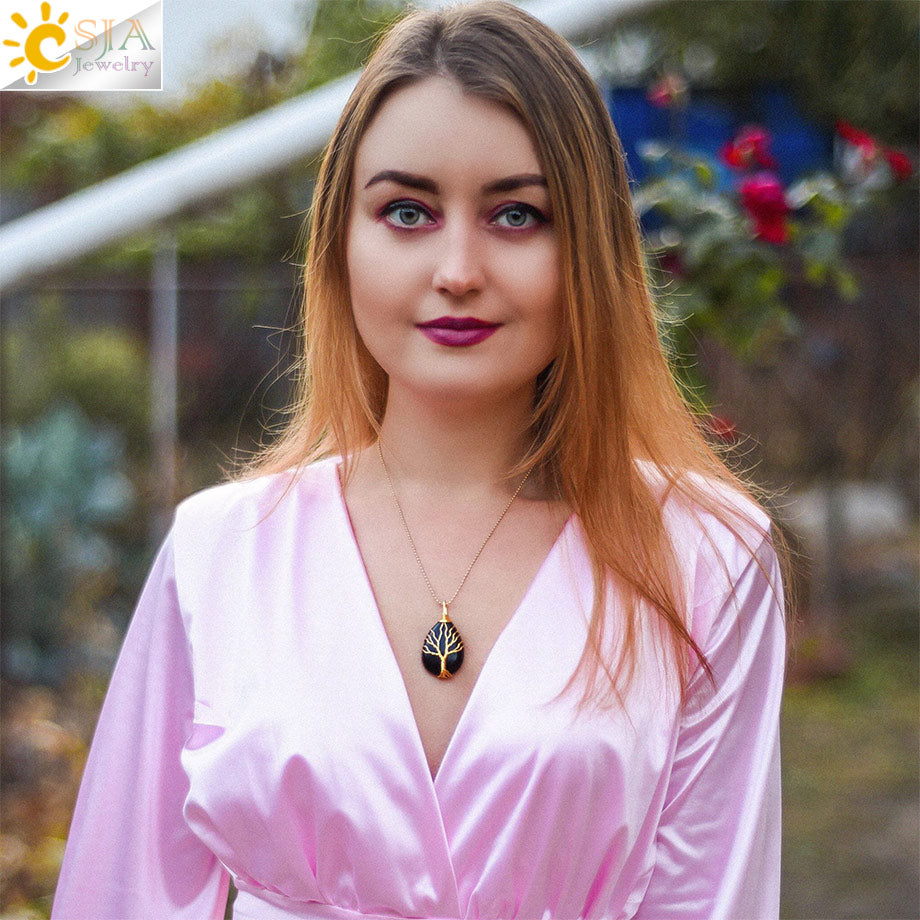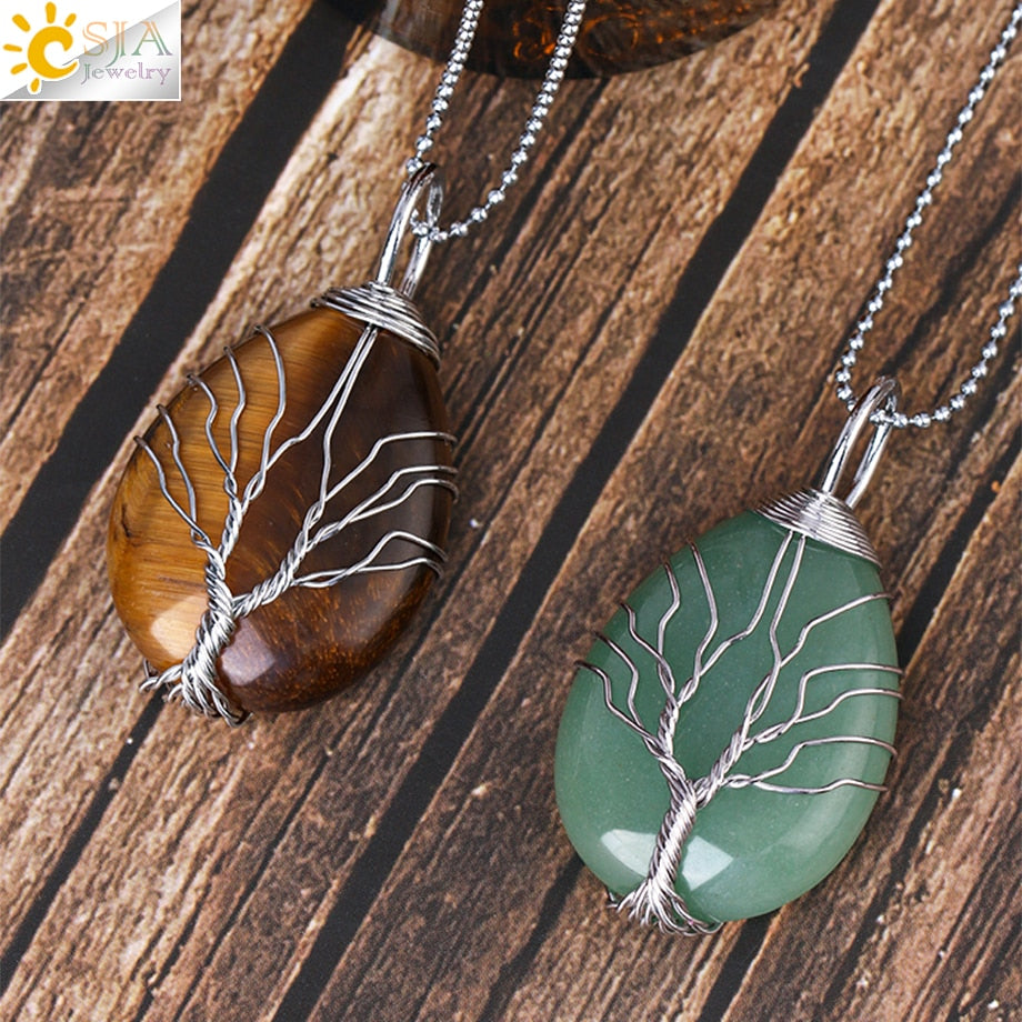 CSJA Tree of Life Crystals Necklace Pendant Water Drop Natural Stone Necklaces Wire Wrap Rose Amethysts Quartz Tiger Eye G953